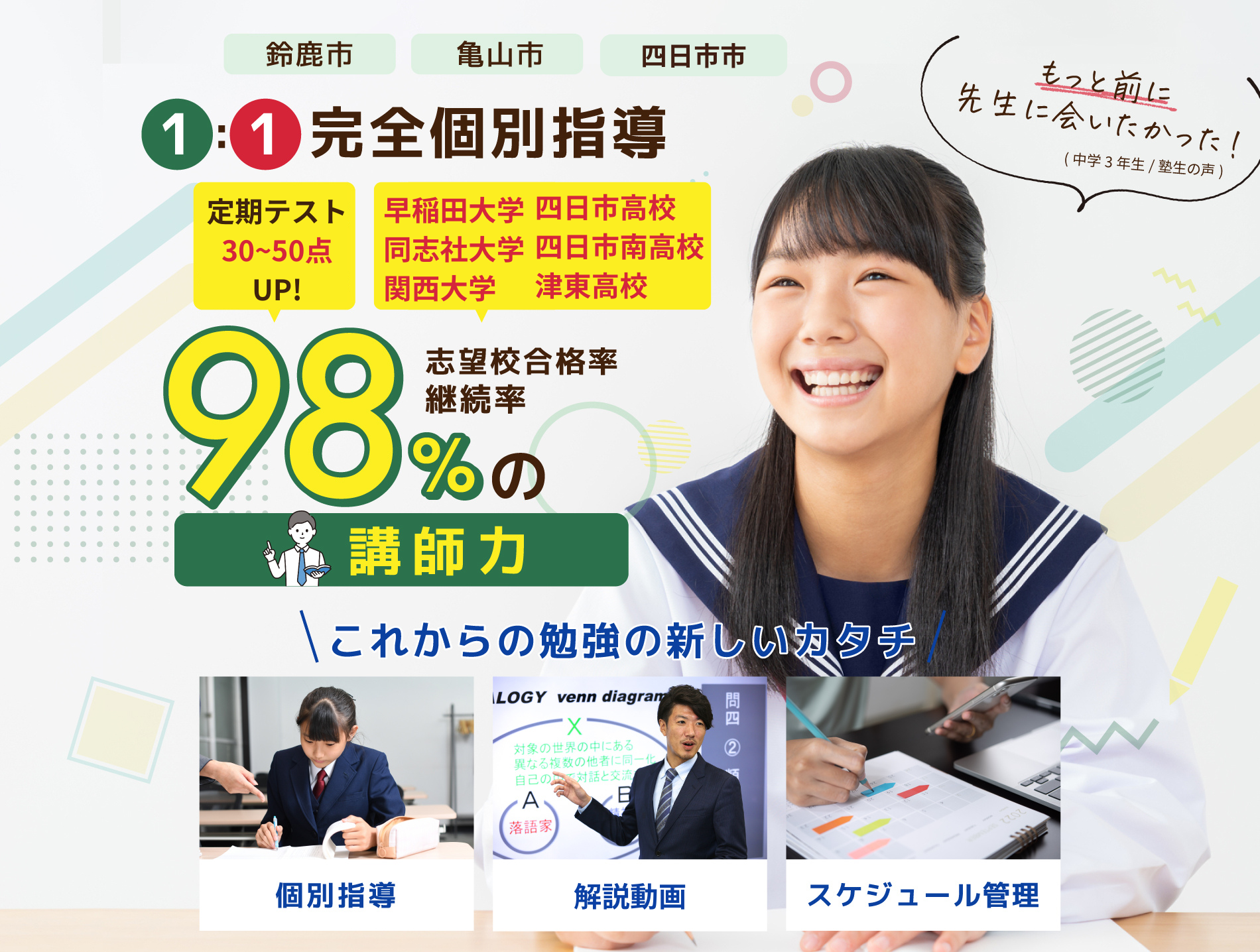 塾長が専属で1人1人の生徒さんを指導することで個別指導とスケジュール管理の徹底サポートを実現しています。