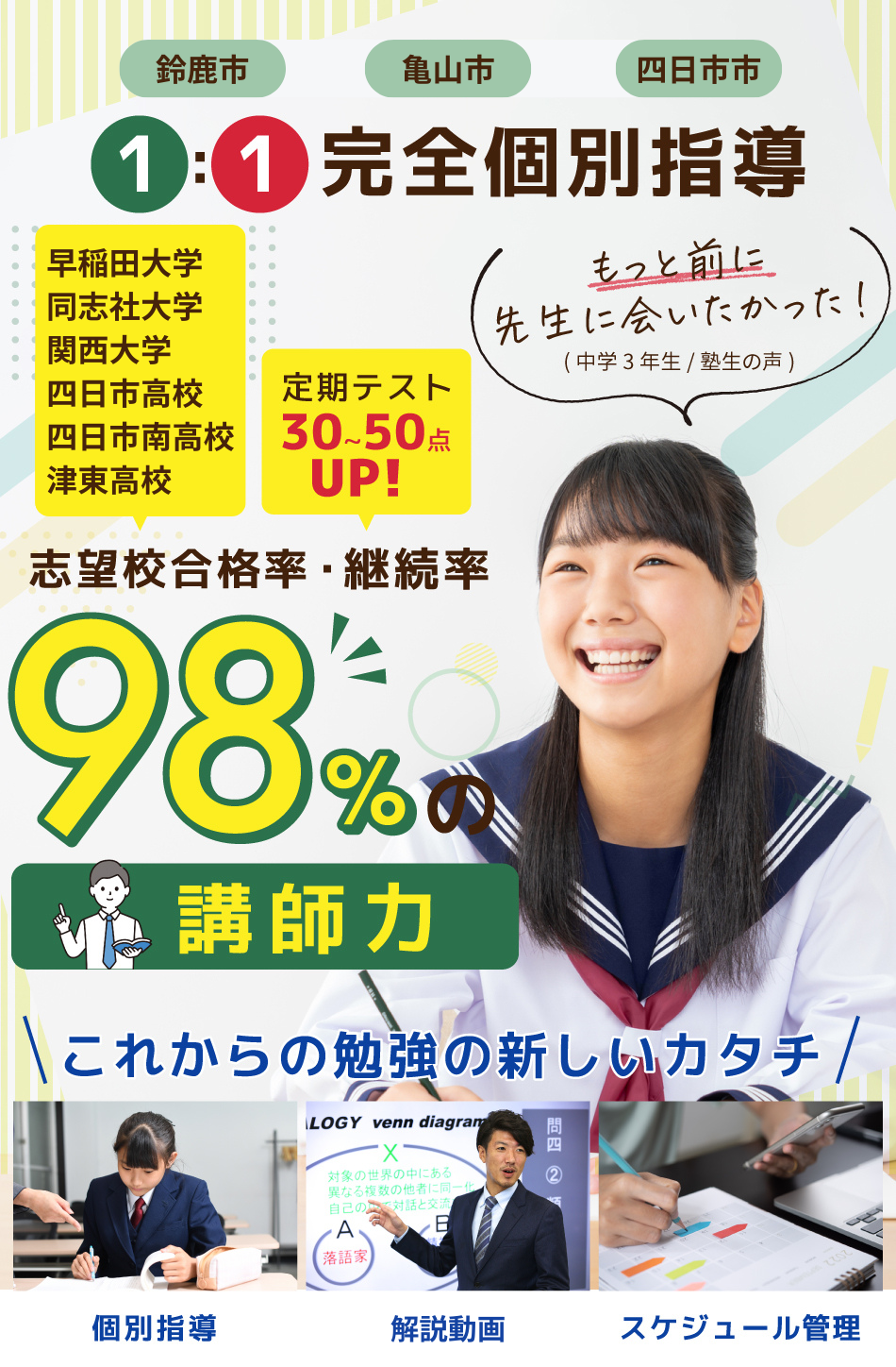 | 時間/週 | 確認テスト20分 対面授業70分 の週1回通塾 |