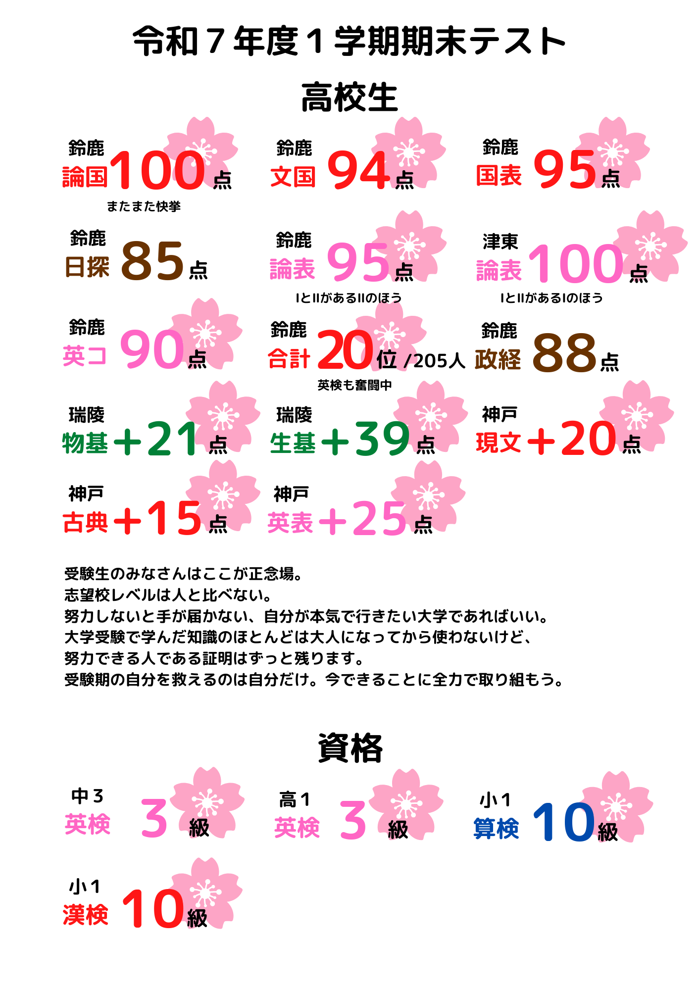 | 時間/週 | 確認テスト20分 対面授業70分 の週1回通塾 |